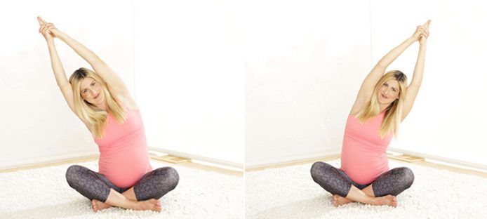 How to do this exercise: Start in an all-fours position and open your knees wide apart. Sit your butt back and down as low as you can go until you can relax your weight down, allowing your back to round. Stretch your arms all the way out in front of you on the floor. If this feels uncomfortable with your baby belly in the way, you can rest on bent elbows.