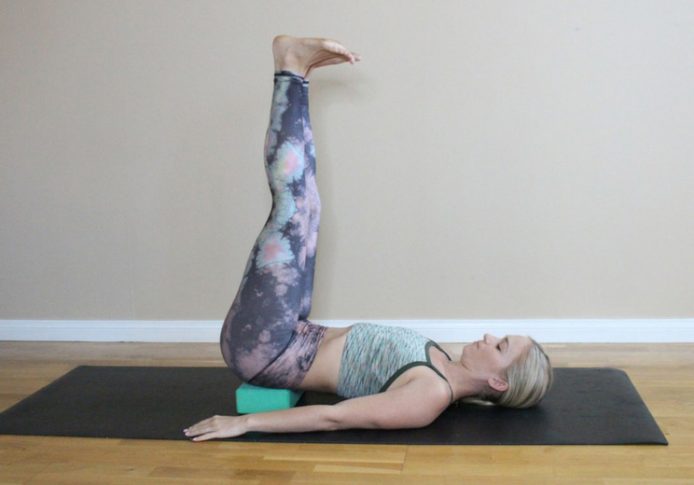 - Pick your feet up off the mat and straighten your legs up to reach your feet towards the ceiling. Your lower back shoulders should feel supported by the block. Keep your palms face down. Close your eyes and hold for 8 slow ujjayi breaths.