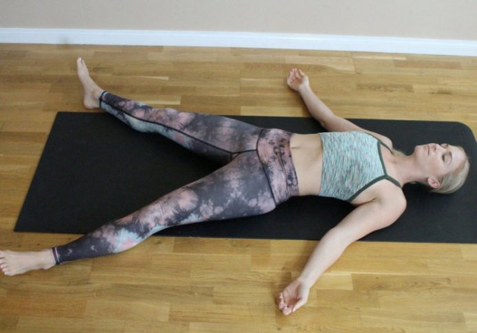 - Begin by lying down on the floor in comfortable Savasana, corpse pose. Turn your palms to face up and take your feet out wide, letting your toes fall outward. Get comfortable and close your eyes. Take 3 deep breaths in through your nose and out through your mouth.